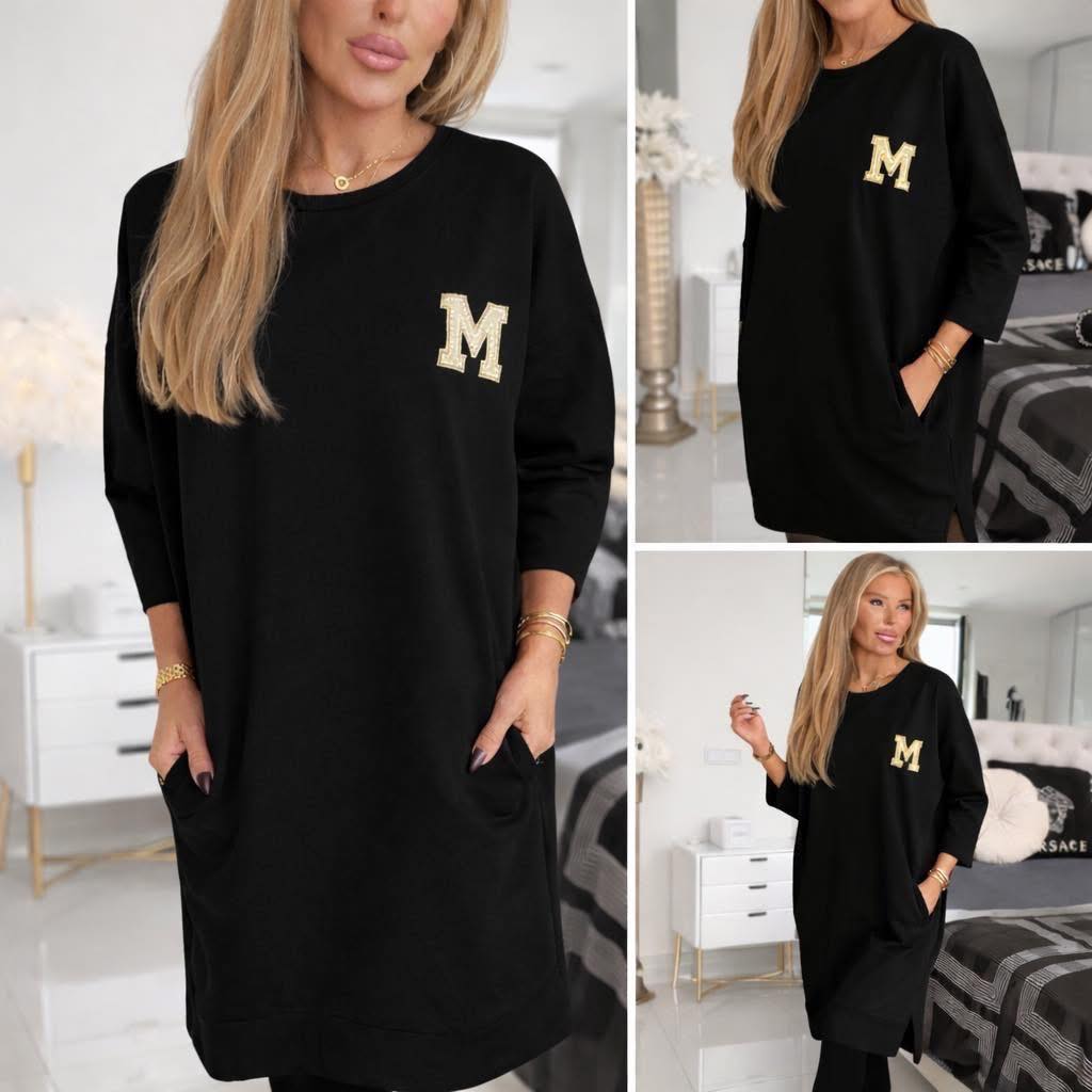 Stylova bavlněná oversize šatovka s kapsami, s rozparkem a vyšitým písmenem M
