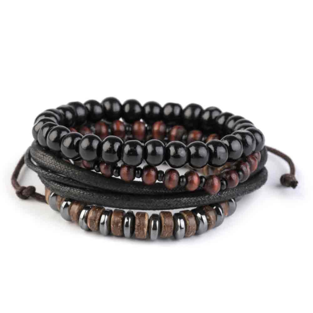 Elegantní a nepřehlédnutelná sada 4 navzájem sladěných náramků z eko kůže a dřevěných korálků v boho stylu. Můžete je nosit najednou nebo samostatně. Jsou vhodné pro ženy i muže - unisex.