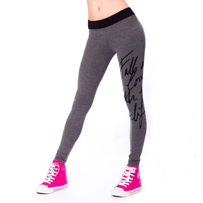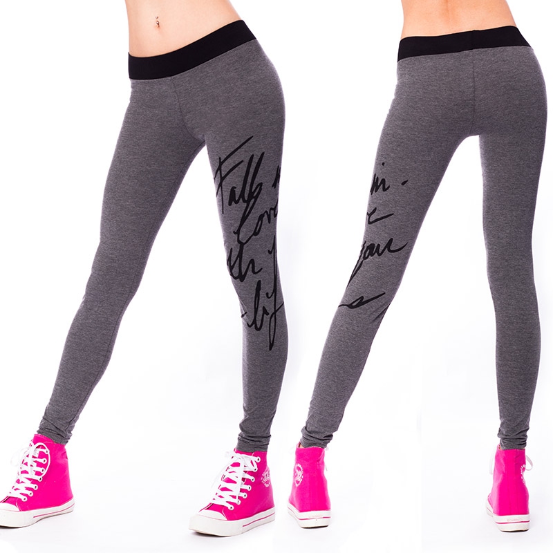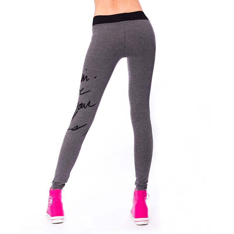 Šedé sportovní legíny s potiskem se Vám budou hodit na lehké sportovní aktivity,do posilovny, na kolo nebo na brusle.