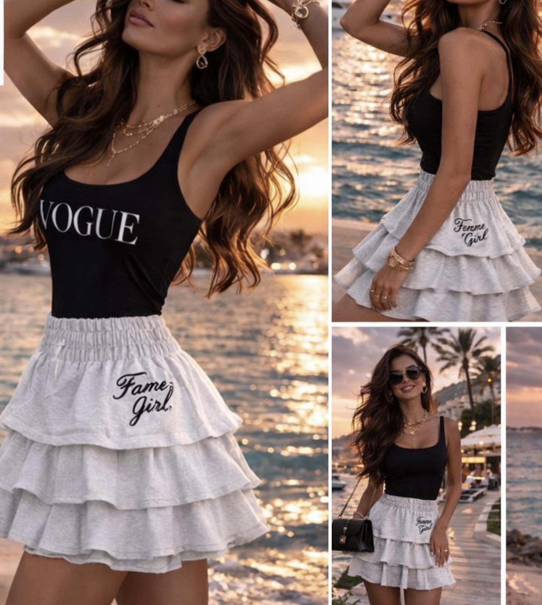Krátká volánková sukýnka s ženským a hravým vzhledem. Model zdobí tři jemné volánky, které dodávají sukni objem a lehkost při pohybu. Zapínání na zip v zadní části zajišťuje pohodlné oblékání a čistý vzhled přední strany.